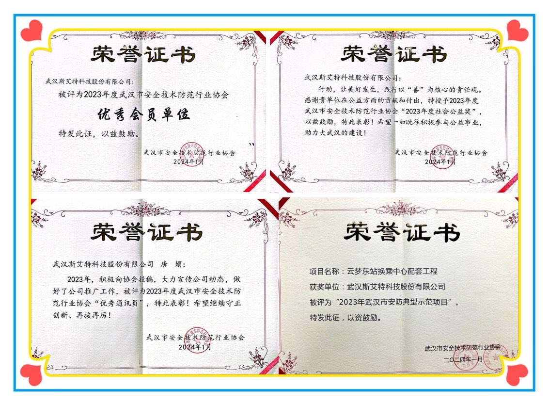 在會議表彰環(huán)節(jié),我司喜獲“2023年度優(yōu)秀會員單位”、“2023年度社會公益獎”;我司行政人事部唐娟被評為“2023年度優(yōu)秀通訊員”;我司云夢東站換乘中心配套工程被評為“2023年武漢市安防典型示范項(xiàng)目”共4項(xiàng)榮譽(yù)。
